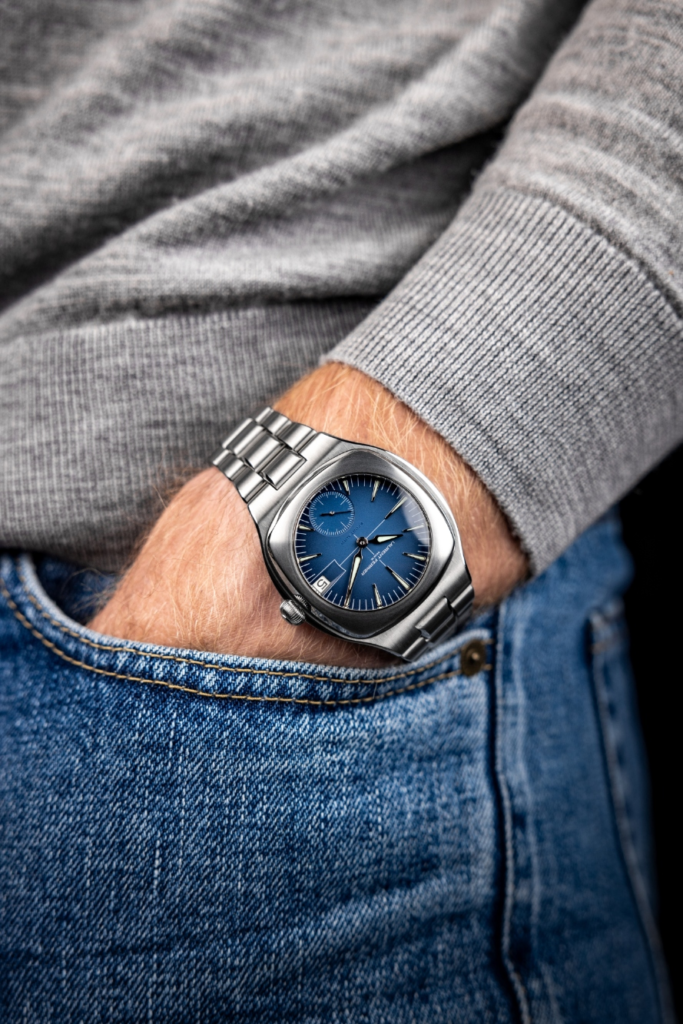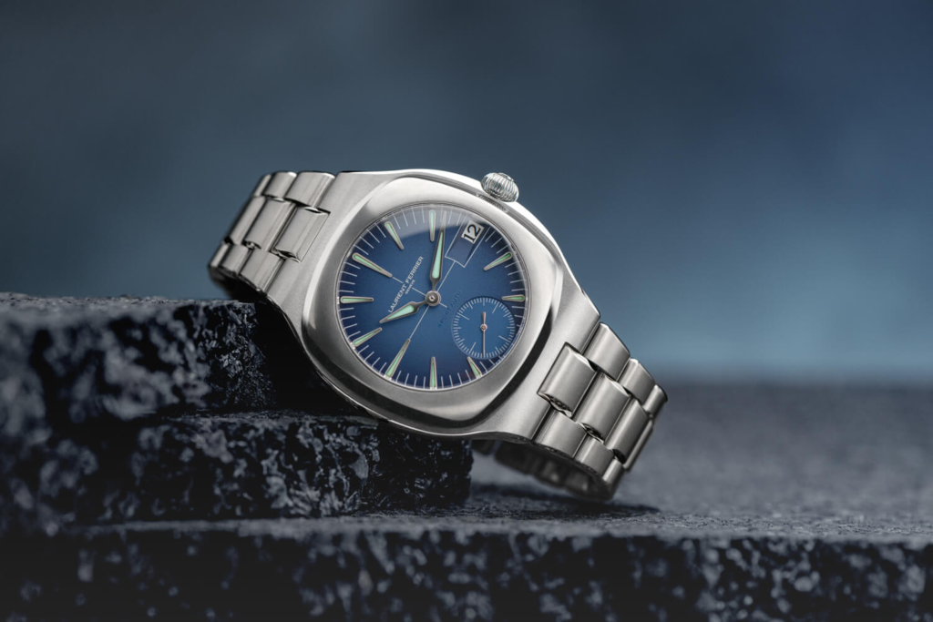 A subtle ombre blue with an opaline finish dominates the dial, set off against a grey minute track and central cross, as well as a small-seconds dial at 6 o’clock with snailed powder-grey markers. Indices and “Assegai” spearhead-shaped hands in white gold and filled with green Super-LumiNova, and a bevelled date window at 3 o’clock make up the rest of the features conceived for maximum legibility and contrast.