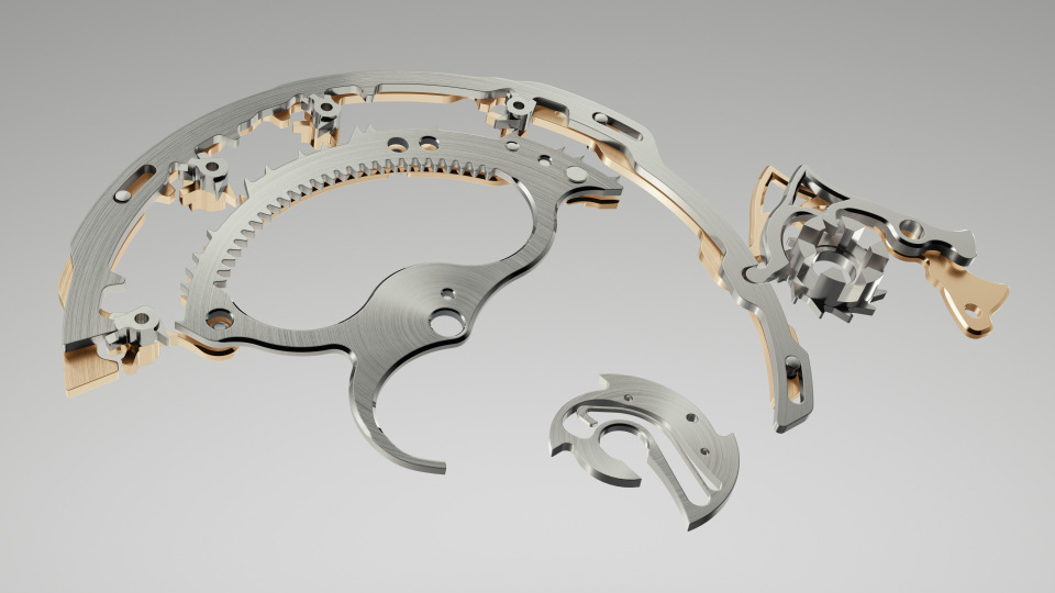 RC: Well, according to the press release, there are 26 bridges on this movement, and these, together with the mainplate, are crafted from 18K gold. You can expect to see their unrestrained use of traditional hand-finishing techniques on both visible and hidden surfaces. Anglage is particularly mentioned during the presentation. There are 135 inward angles across all bridges, and they were executed at a 30° angle instead of the regular 45° angle in order to maximise reflection of light with the upward surfaces.