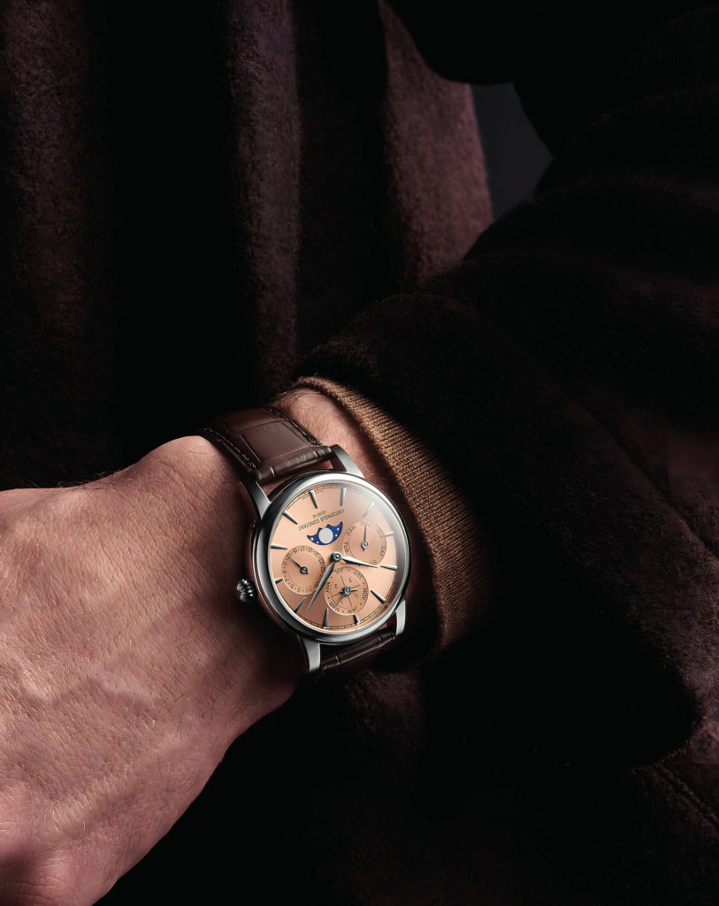 This year, Frederique Constant has updated its Classic Perpetual Calendar Manufacture with the new in-house Calibre FC-776, which now boasts a power reserve of three days. The case has also been reduced in size, from 42mm to a more refined 40mm. This appears to be the first time Frederique Constant has introduced a salmon dial to this model. The three subdials that make up the calendar display are slightly recessed into the sunray-brushed dial surface, which plays beautifully with the light. They are framed by applied hour markers that complement the elegant dauphine-style hands. Paired with a brown alligator leather strap, the watch commands an official RRP of CHF 9,995. It is a compelling option within the world of high complications indeed but the unbeatable value proposition here is well known. This means this model is frequently sold out, so be aware of this.