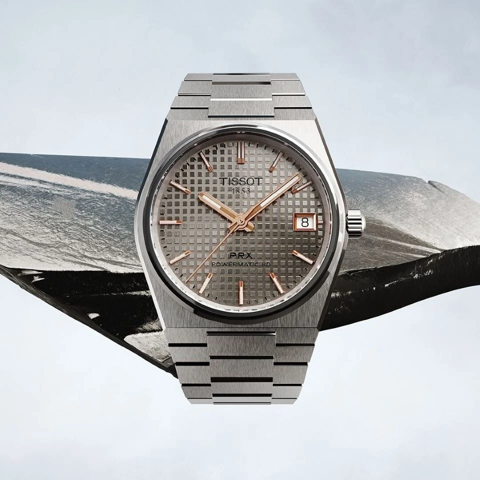 For the titanium watches, there are two variants, including one with a deep-blue waffle dial that appears to be very similar to existing waffle dials from Tissot. It features nickelled (sic) baton hands and applied indexes, keeping the look cool and sharp. The second option is more distinctive, with an anthracite dial paired with rose-gold-coloured hands and indexes. There is a refined and contrasting edge to this variant, and it also looks quite apart from any steel PRX with a blue waffle dial.